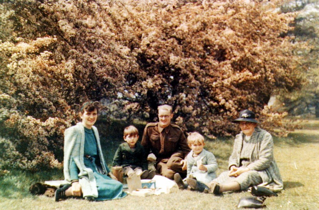 This photograph, taken in the spring of 1941, is the last colour photograph my father would take before the end of world war II. it was taken in Dufay colour a now extinct colour process. The people shown are: from the left. my mother. my elder brother, my Godfather Geoff Gee, me, and my grandmother on my mother’s side. The picture was taken in Kew gardens.