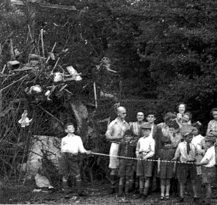 for the bombing and the V1s and V2s, and by May 1945 there were already builders and decorators at work repairing the damage, paid I presume by the Government. In our house all the interior ceilings were cracked and need to be replaced. This meant that plasterboard replaced the plaster and lath construction that had previously been there. This in turn meant that there was a large amount of discarded wood around, not only from our house, but others on the street. It was decided to have a neighbourhood bonfire to celebrate the end of the war in Europe. Using a hand cart a mass of combustibles was collected and take to a vacant site just down the road. A scarecrow type reproduction of Hitler was hung from a telegraph pole outside our house, with a message on a sheet of paper pinned to his chest, it read “mit me 7:30, watch me burn 7:45″. At 7:30 we duly processed down the road with the neighbours and a magnificent blaze ensued. I have no doubt that the adults carried on a more alcoholic celebration later that night but it would have been after my bedtime.